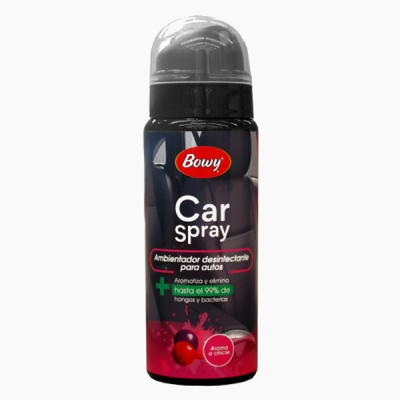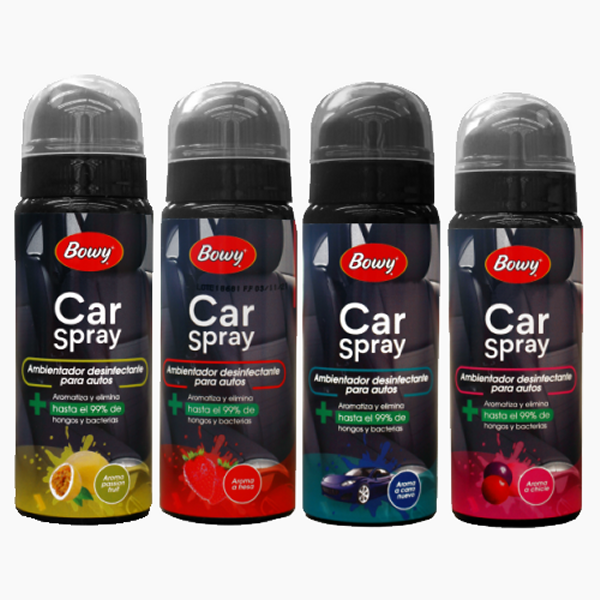 Ambientador Bowy Car Spray, Aromatiza y desinfecta superficies eliminando hasta el 99% de los hongos y bacterias, disponible en 4 agradables aromas.